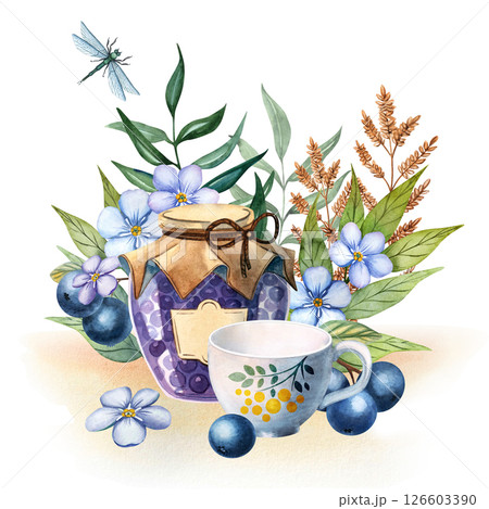 Watercolor Composition with Jam Jar, Tea Cup and Blueberries