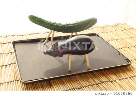 お盆に飾られるご先祖をお迎えする精霊馬 野菜でできた牛馬3 初盆のイメージ