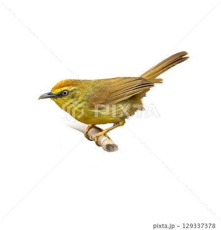 Pin-striped Tit Babbler perched on a branch, showing yellow underparts and brown-streaked plumage.
