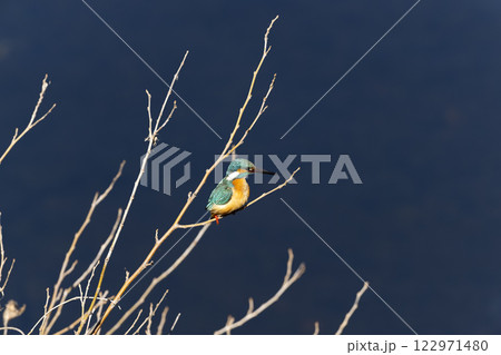 埼玉県川越市池辺 川越水上公園 修景池(ボート池)の水辺の枝にとまり羽繕いするカワセミ