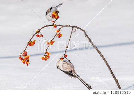冬の北海道の公園で巣作り中のシマエナガ