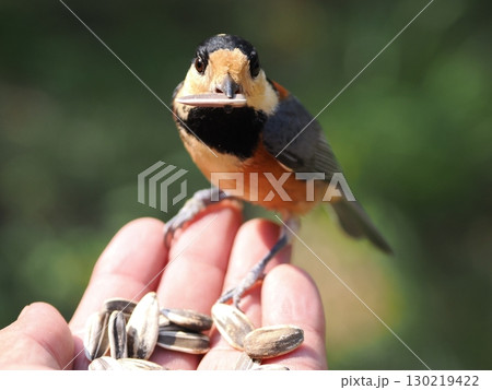 手のひらでヒマワリのタネを食べる可愛い小鳥のヤマガラ