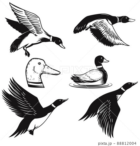 Set of illustrations of wild duck. Duck in flight, duck swimming on water. Design element for logo, label, sign, poster, card, banner. Vector illustration