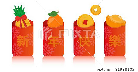 4個農曆新年元素,農曆新年紅包錢袋矢量卡通卡通,文字翻譯:新年快樂
