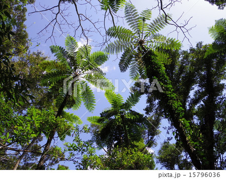 青空を背景にしたヒカゲヘゴ、金作原原生林、鹿児島県奄美大島