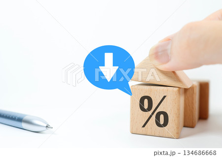 金利低下や割合ダウンを示すブロックと一万円札。