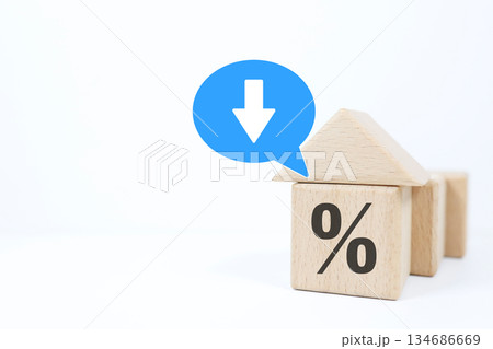 金利低下を示す積み木の家と%記号。住宅ローンの概念。