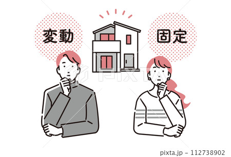 戸建ての住宅ローンについて考える若い夫婦のシンプルなベクターイラスト素材