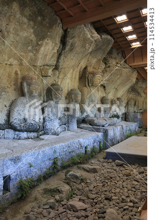 国宝臼杵石仏、大日如来を中心に左右に一列に仏像を刻んだ古園石仏