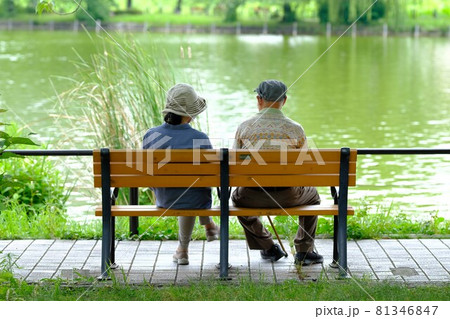 池のほとりのベンチに座る老夫婦