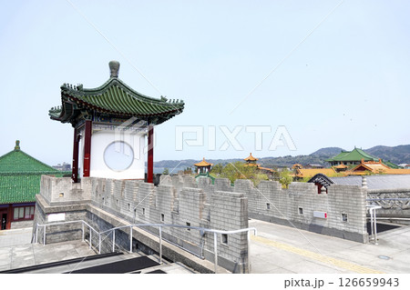鳥取県 燕趙園 万里長城のような歩道橋(金山嶺橋)から中国庭園の建造物を眺める