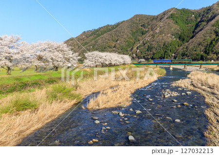 八東川の土手に咲く満開の桜と若桜鉄道の気動車