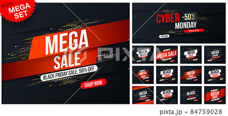 Big set of Mega sale banners with gold halftone glitter effect for special offers, sales and discounts on shopping day Black Friday. Promotion and shopping template for Black Friday