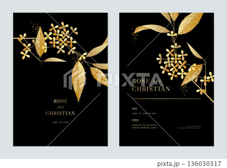 Floral wedding invitation card template design, golden Osmanthus fragrans flowers with leaves on black