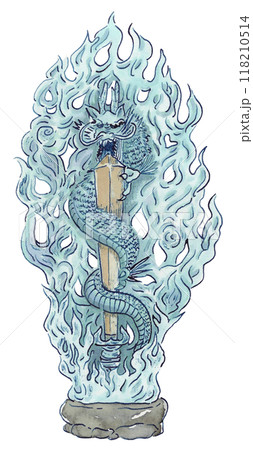 水彩で手描きした龍の絵:剣(倶利伽羅剣)に絡みついた竜の姿/竜王は不動明王の化身