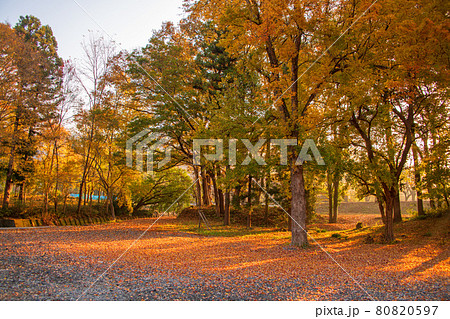 長瀞の秋 蓬莱島公園の景色 学童登校風景 朝日を浴びる紅葉
