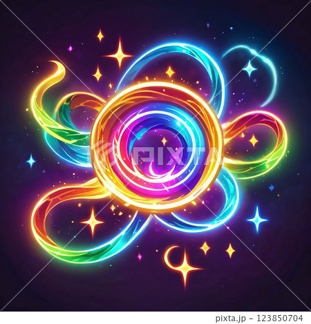 A swirling, vibrant, multicolored ring with a crescent moonshaped glow, surrounded by sparkling golden stars on a deep purple background.