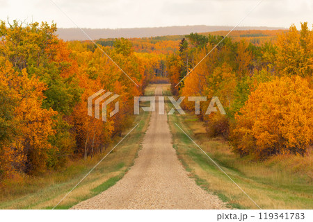 Country road with gravel among bright yellow autumn trees in the woodland.
