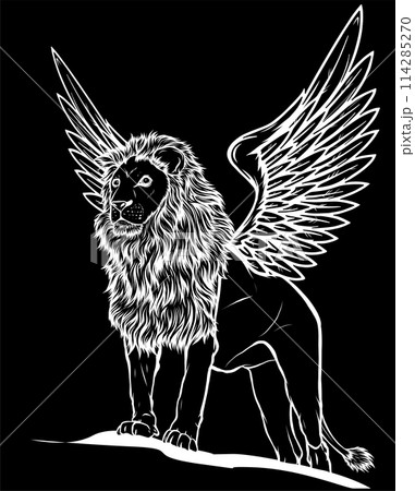 white silhouette of Winged Lion on black background vector design