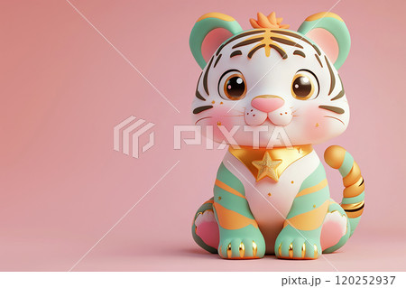 A cartoon tiger with gold and pink stripes and a pink nose is sitting on a pink background. The tiger has a star on its head and is smiling