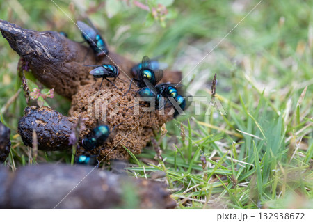 野良猫の糞に集まった蝿 キンバエ 銀バエ