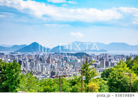 広島市西部の高台(竜王公園)付近から、広島市の南東方面を展望しています。瀬戸内海が見えます。
