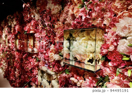 水槽と花と金魚(奈良の金魚ミュージアム)