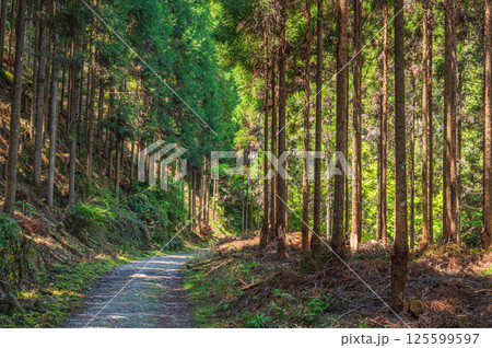 針葉樹林の中の林道 京都市高雄