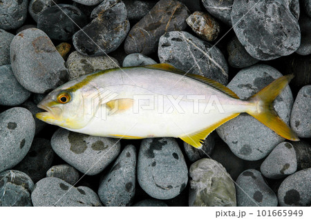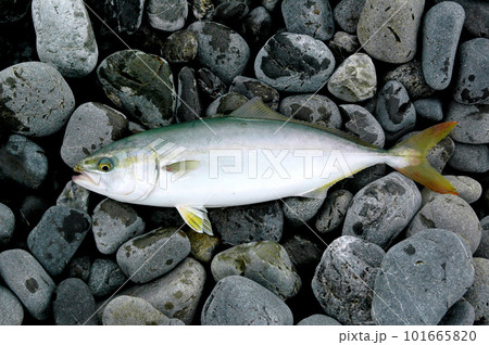 カンパチの若魚を釣って、浜の玉石の上に寝かせて撮った