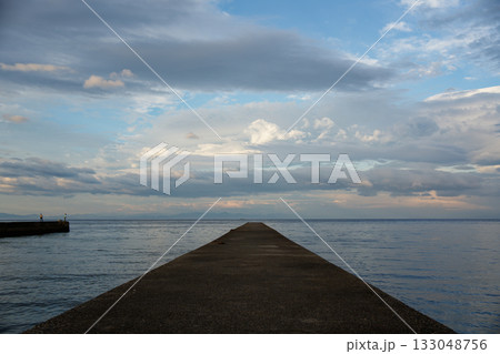 海へ続く防波堤と広がる空 穏やかな夕暮れの内海海岸(愛知県南知多町)
