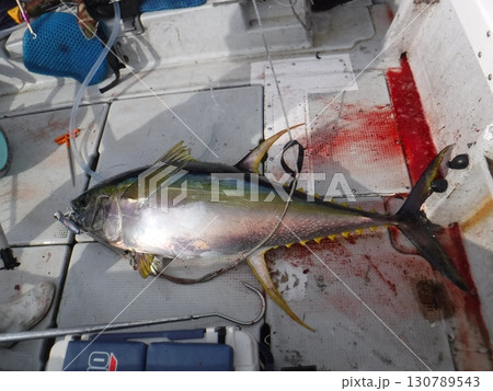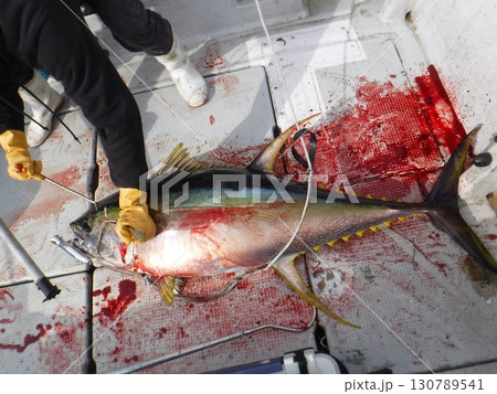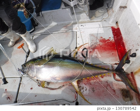 釣り上げられた大物マグロと漁船デッキの光景