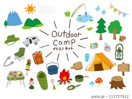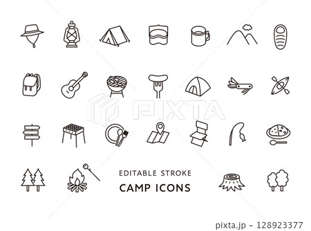 抜け感のある線で描いたアウトドア・キャンプのアイコンセット
