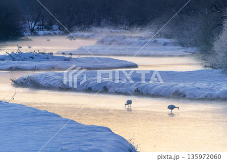 朝日輝く雪裡川で休む二羽のタンチョウ