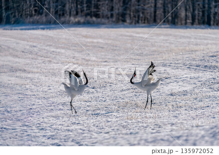 北海道で見られる日本を代表する美しい野鳥、冬の雪原の真白なタンチョウ