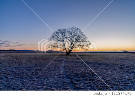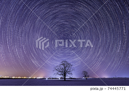 地平線が赤く染まる冬のハルニレの木と星の光跡風景