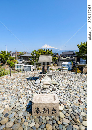 静岡県富士市にある鈴川の富士塚の向こうに富士山を望む