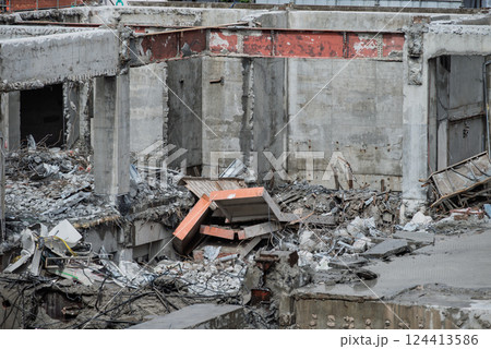 解体工事現場 コンクリートの躯体と鉄筋くず
