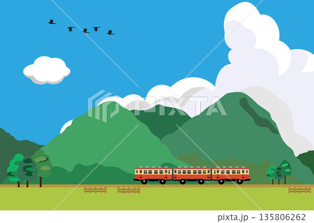 夏、入道雲がわく青空の下、おもちゃ風の気動車が走る風景のイラスト