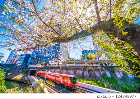 日本の東京都市景観 珍景。丸ノ内線2000系や御茶ノ水駅、聖橋。水面には花筏が広がる
