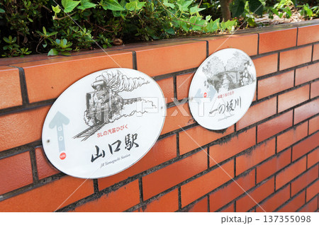 山口駅のSL案内板とレンガ壁