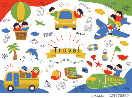 Vector transportation set with children. Funny water, land, air transport collection with drivers for kids. Cars and vehicles clip art. Cute car, train, truck, bus, plane, icons with passengers