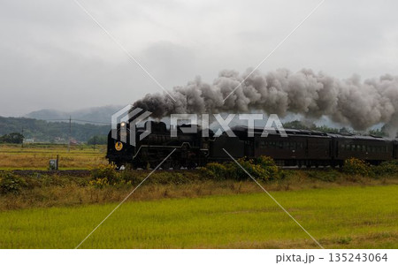 黒煙を上げて田園を駆けるSLやまぐち号