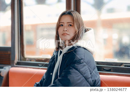 レトロ列車内で立つ20代女性のポートレート