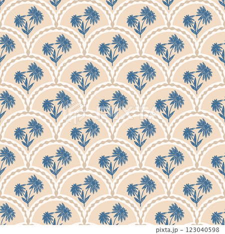 Flowers crayon drawn seamless pattern. Floral allover background. Stylized botany scallop repeat backdrop. Surface pattern design spring motif. Vector hand drawn illustration