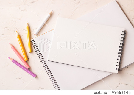 パステルカラーの色鉛筆とスケッチブック大小白紙