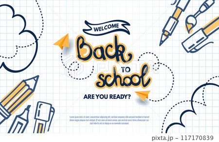 Welcome back to school web banner. Doodle creative poster with back to school lettering logo, paper planes, hand drawn clouds and school supplies. Checkered notebook background, education concept