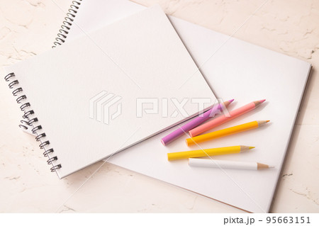 パステルカラーの色鉛筆とスケッチブック大小白紙