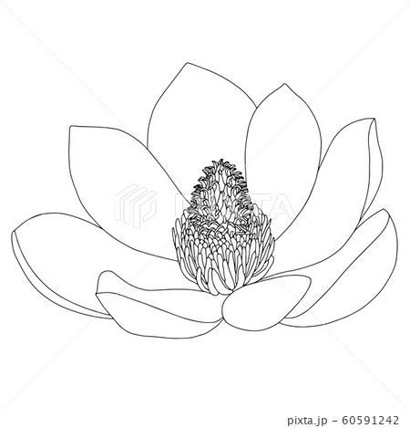 Magnolia flower sketch on white background. Floral botany. Hand drawn botanical illustration in black and white. Line art. Big floral outline vector element.