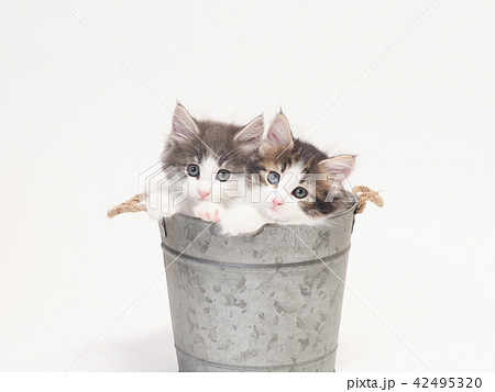 鉢カバーに入った2匹のノルウェージァンフォレストキァットの仔猫