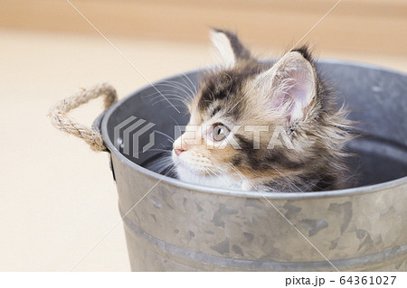 鉢カバーに入ったメインクーンの仔猫